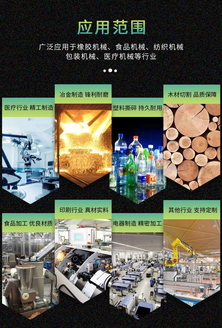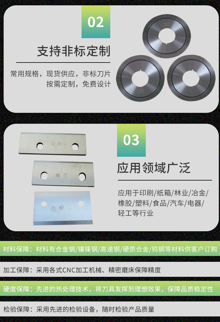 該系列分切機(jī)刀片主要用于分切紙張、薄膜、金箔、橡膠制品、塑料制品等。刀片鋒利,切割精度高、并且持久耐磨。